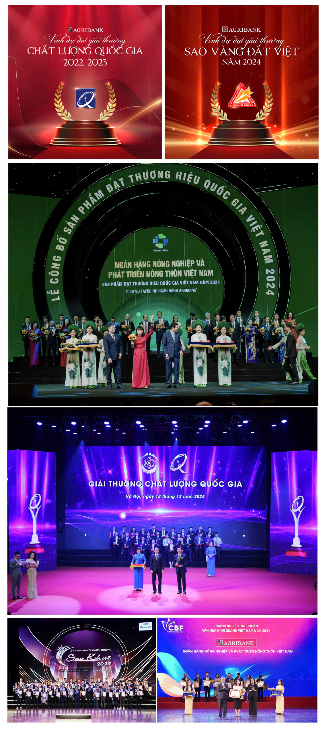 Agribank là Ngân hàng duy nhất được vinh danh “Doanh nghiệp đạt chuẩn Văn hóa kinh doanh Việt Nam năm 2024”; thúc đẩy nâng cao chất lượng nguồn nhân lực, thực thi và lan tỏa văn hóa doanh nghiệp. Agribank được xếp hạng 10 doanh nghiệp nộp thuế lớn nhất và là ngân hàng nộp thuế thu nhập doanh nghiệp thứ 2 ở Việt Nam. Tiếp tục được Moody’s xếp hạng “Ba2”, Fitch Ratings xếp hạng “BB+”, triển vọng Ổn định, tương đương với mức xếp hạng tín nhiệm quốc gia và là mức xếp hạng cao nhất trong số các ngân hàng Việt Nam; Được NHNN xếp loại A, cải thiện điểm xếp hạng năm 2023.