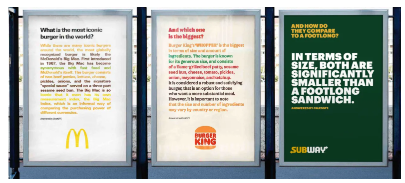 AI mang đến những cơ hội mới để tạo ra các chiến dịch sáng tạo, cá nhân hóa, đáp ứng nhu cầu đa dạng của khách hàng từ kênh OOH tới các kênh quảng cáo khác. Nếu bạn chưa tin, hãy thử xem ngay chiến dịch quảng cáo ngoài trời với sự hỗ trợ từ ChatGPT của McDonald’s và Burger King