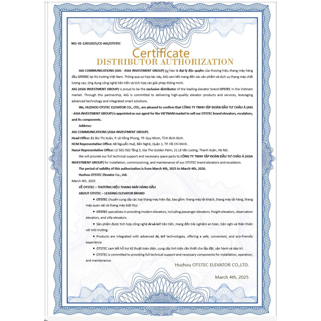 Là đơn vị phân phối độc quyền thang máy OTSTEC tại Việt Nam, AIG Communications không chỉ cung cấp sản phẩm chính hãng mà còn mang đến dịch vụ hỗ trợ toàn diện, đảm bảo khách hàng nhận được giải pháp thang máy tối ưu, an toàn và bền vững.