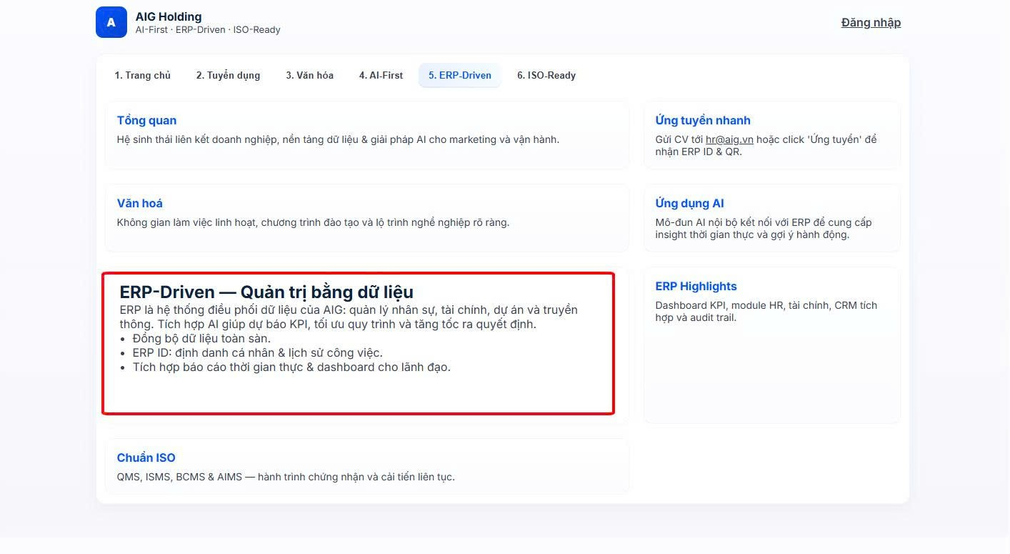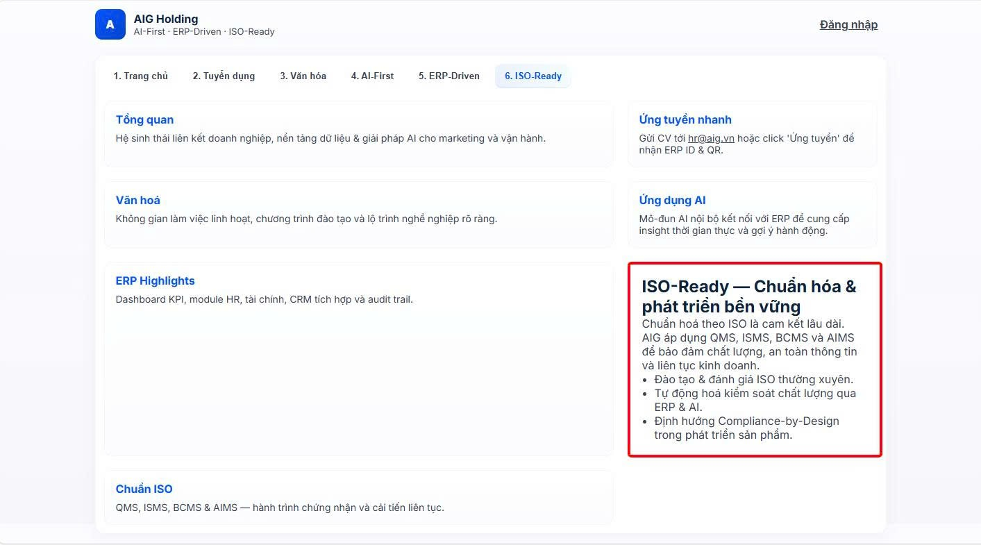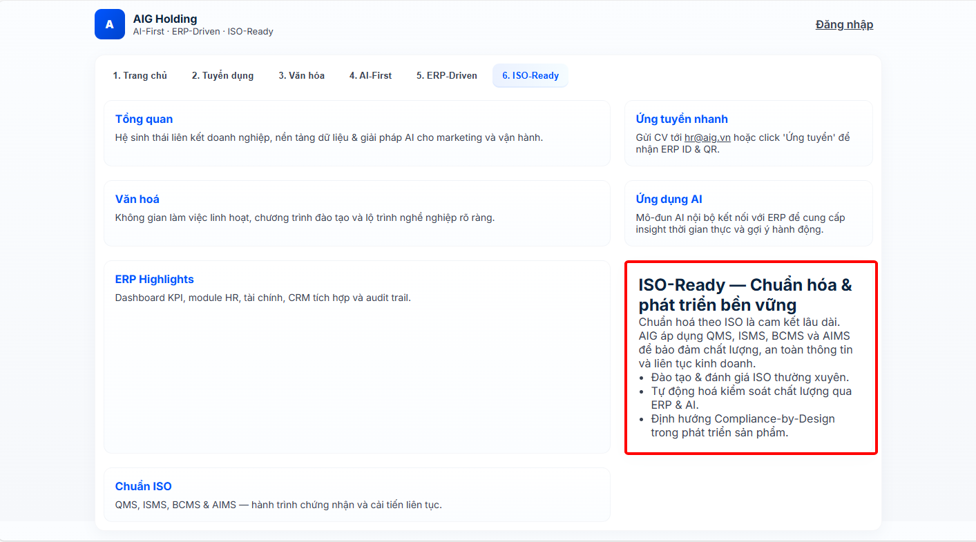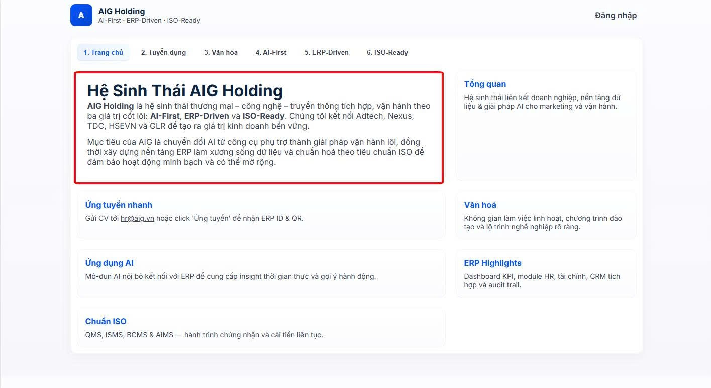Trên mọi trang của hệ thống, Header AIG Holding luôn hiện diện với logo và slogan: AI-First · ERP-Driven · ISO-Ready