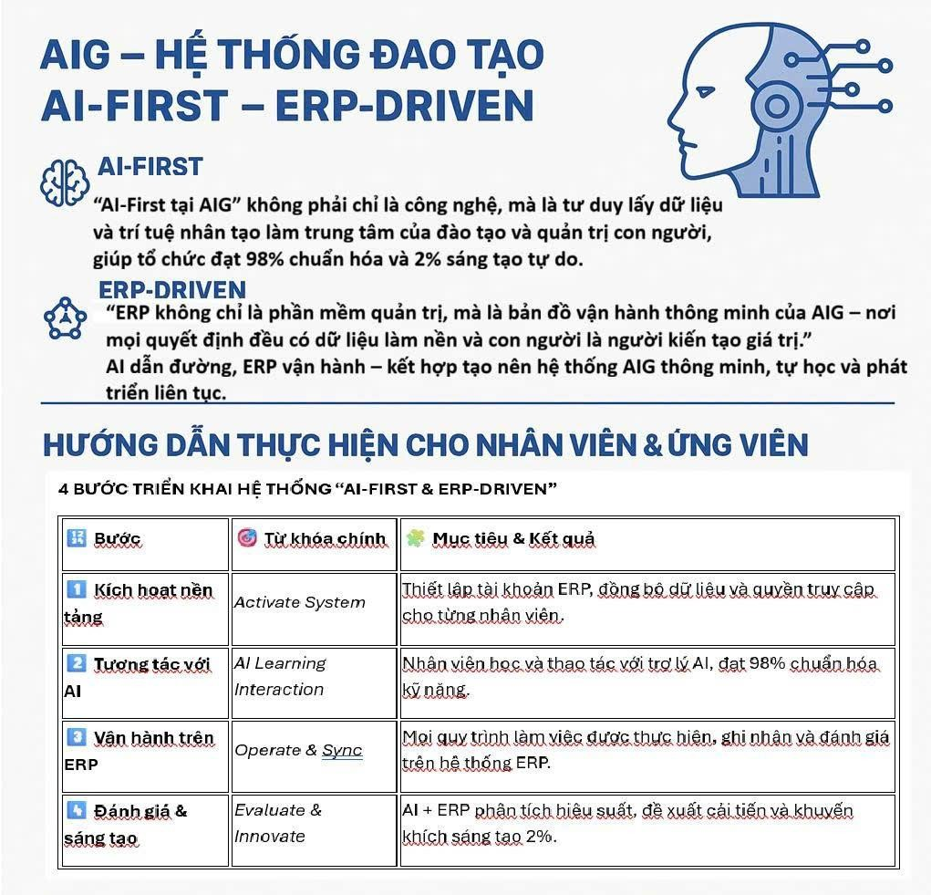 Mục tiêu của AIG là chuyển đổi AI từ công cụ phụ trợ thành giải pháp vận hành lõi, đồng thời xây dựng nền tảng ERP làm xương sống dữ liệu và chuẩn hoá theo tiêu chuẩn ISO để đảm bảo hoạt động minh bạch và có thể mở rộng.