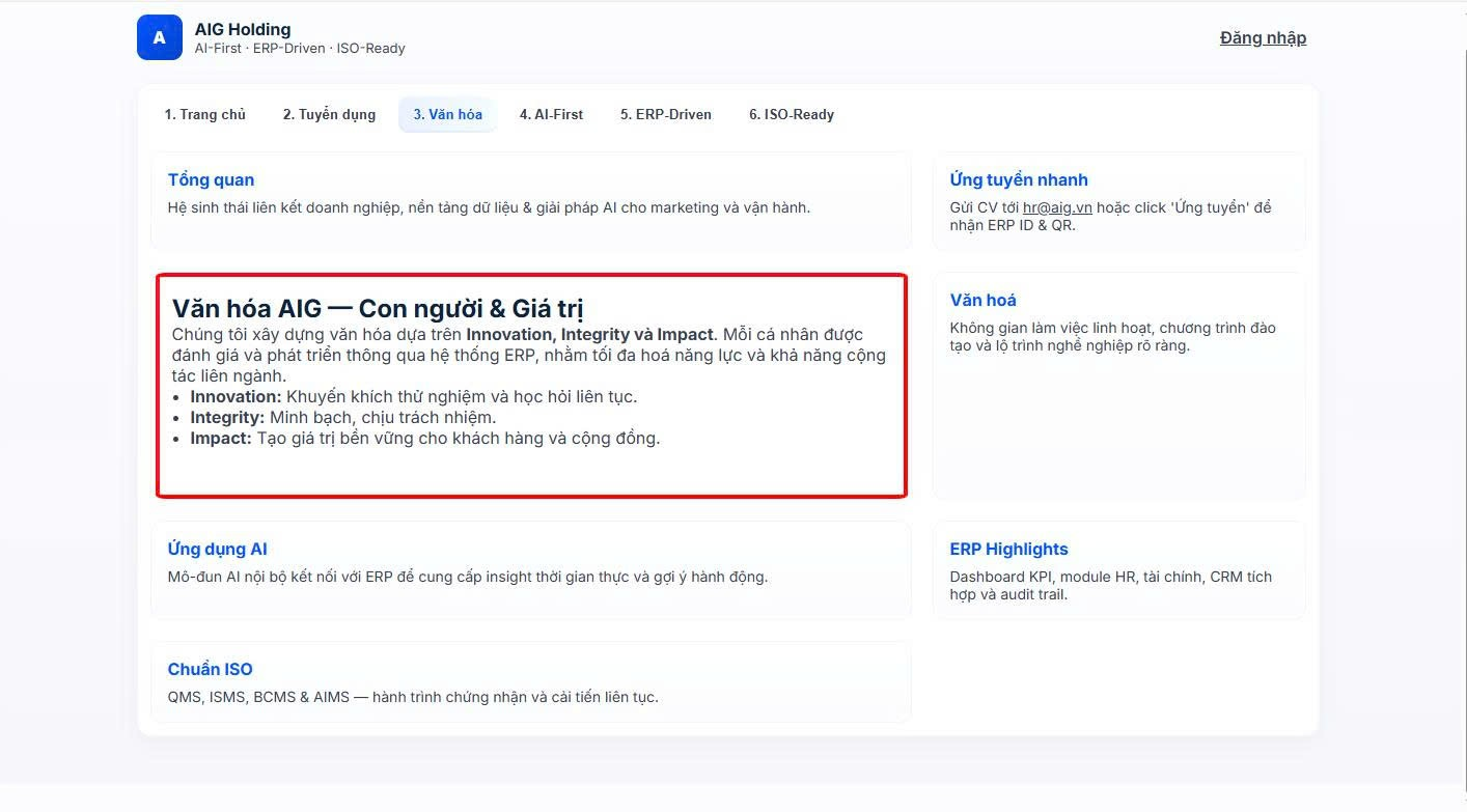 Liên kết trực quan với các tab: Trang chủ, Tuyển dụng, Văn hóa, giúp người dùng dễ dàng nhận diện tổng thể hệ sinh thái AIG
