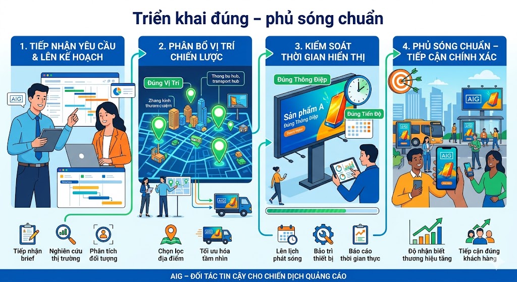 Điểm khác biệt của AIG không nằm ở việc “có bao nhiêu vị trí”, mà nằm ở việc tối ưu giá trị trên từng vị trí. Mỗi bảng quảng cáo, mỗi màn hình LED đều được khai thác với chiến lược rõ ràng, giúp khách hàng: