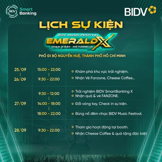 19h00: Đêm nhạc BIDV Music Festival – Emerald X chính thức bùng nổ với sự góp mặt của dàn sao đình đám, mang đến những màn trình diễn đỉnh cao, thăng hoa cảm xúc.