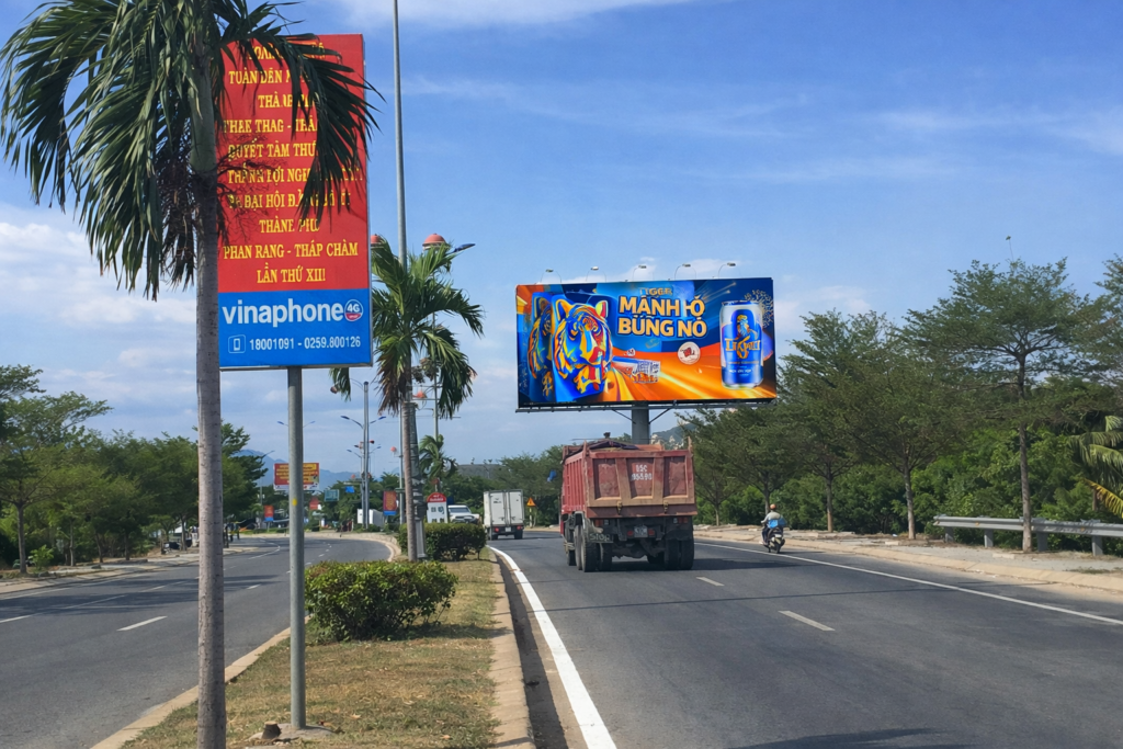 Nằm tại vòng xoay QL1A – vòng xoay phía Bắc TP. Tháp Chàm (Ninh Thuận), billboard 3 mặt này sở hữu vị trí chiến lược hiếm có, nơi mọi luồng giao thông đều buộc phải đi qua, giảm tốc và quan sát. Đây chính là lợi thế “ăn tiền” giúp thông điệp quảng cáo đập thẳng vào tầm nhìn người đi đường.