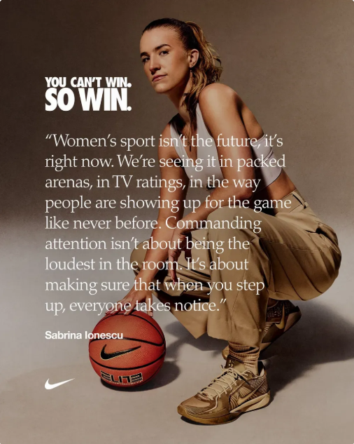 Thay vì tập trung vào các vận động viên nam đang thi đấu trên sân, Nike chuyển hướng ánh đèn sân khấu về phía những nữ vận động viên đang viết lại luật chơi của thể thao và xã hội. Quảng cáo quy tụ dàn sao nữ đình đám như Caitlin Clark, A’ja Wilson, Sophia Smith Wilson, Sha’Carri Richardson và Sabrina Ionescu. Với câu slogan “You can’t win, so win” (Bạn không thể thắng, vậy hãy thắng đi), Nike muốn truyền tải thông điệp mạnh mẽ rằng: Không có gì sai khi muốn trở thành người giỏi nhất. Quảng cáo nhấn mạnh vào việc phá vỡ định kiến và vượt qua giới hạn, đặc biệt là đối với các nữ vận động viên.