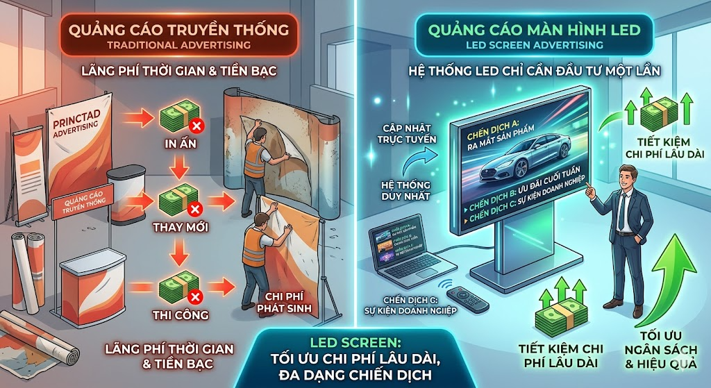 So với các hình thức quảng cáo truyền thống, công nghệ LED mang đến sự chủ động vượt trội, giúp doanh nghiệp không chỉ truyền tải thông tin mà còn liên tục tối ưu và nâng cấp chiến dịch trong suốt quá trình triển khai.