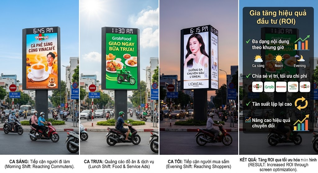 Đặc biệt, nội dung có thể được tùy chỉnh linh hoạt theo từng khung giờ, từng khu vực hoặc từng nhóm đối tượng khách hàng khác nhau – ví dụ: thông điệp khác nhau vào giờ cao điểm, giờ nghỉ trưa hay buổi tối. Điều này giúp tối ưu hiệu quả truyền thông, đảm bảo thông điệp luôn “đúng người – đúng thời điểm – đúng ngữ cảnh”.