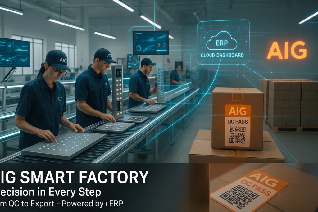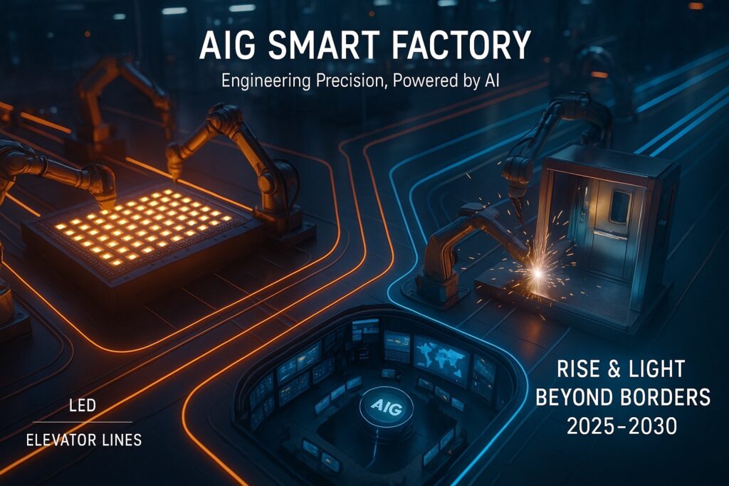 Hai dòng sản phẩm LED và Elevator đều được sản xuất tại AIG Smart Factory, một trung tâm công nghiệp hiện đại vận hành theo mô hình ERP – MFO – AI Management. Tại đây, toàn bộ quy trình QC – Packing – Export đều được tự động hoá và giám sát bằng cảm biến, giúp tiết kiệm 30% năng lượng, giảm lỗi thủ công xuống còn 0,5%.