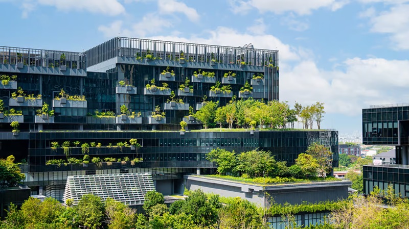 - Tầng cao: cây xanh tán rộng, vườn treo, mái xanh trên các công trình.