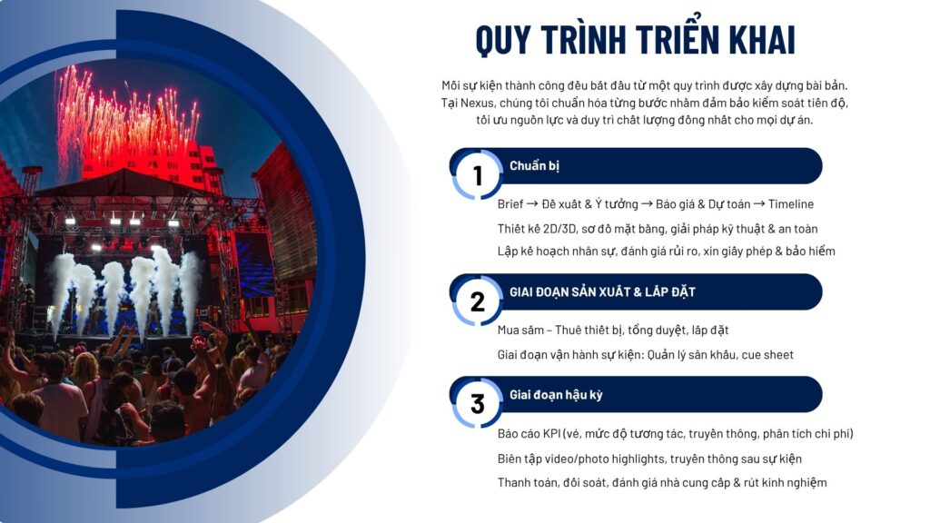 💡 Với chúng tôi, mỗi sự kiện không chỉ là nhiệm vụ – mà là một hành trình sáng tạo và tận tâm, nơi Nexus biến mọi ý tưởng của khách hàng thành khoảnh khắc thăng hoa thực sự trên sân khấu.