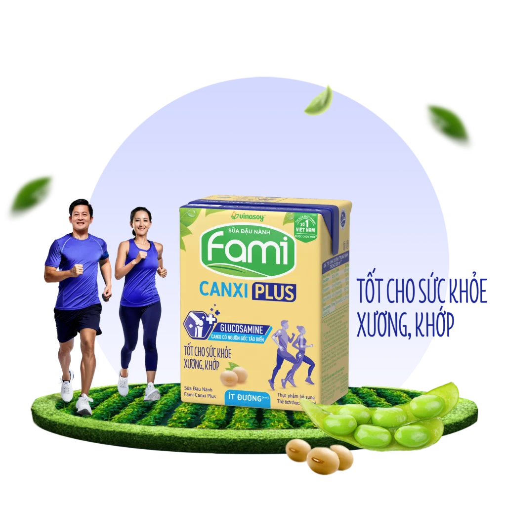 Sữa đậu nành Fami Canxi Plus được làm từ 100% đạm thực vật, đặc biệt bổ sung Glucosamine và Canxi có nguồn gốc tảo biển giúp thêm CHẮC XƯƠNG, KHỎE KHỚP TRĂM PHẦN, cân bằng cuộc sống khi sử dụng 2 hộp mỗi ngày!