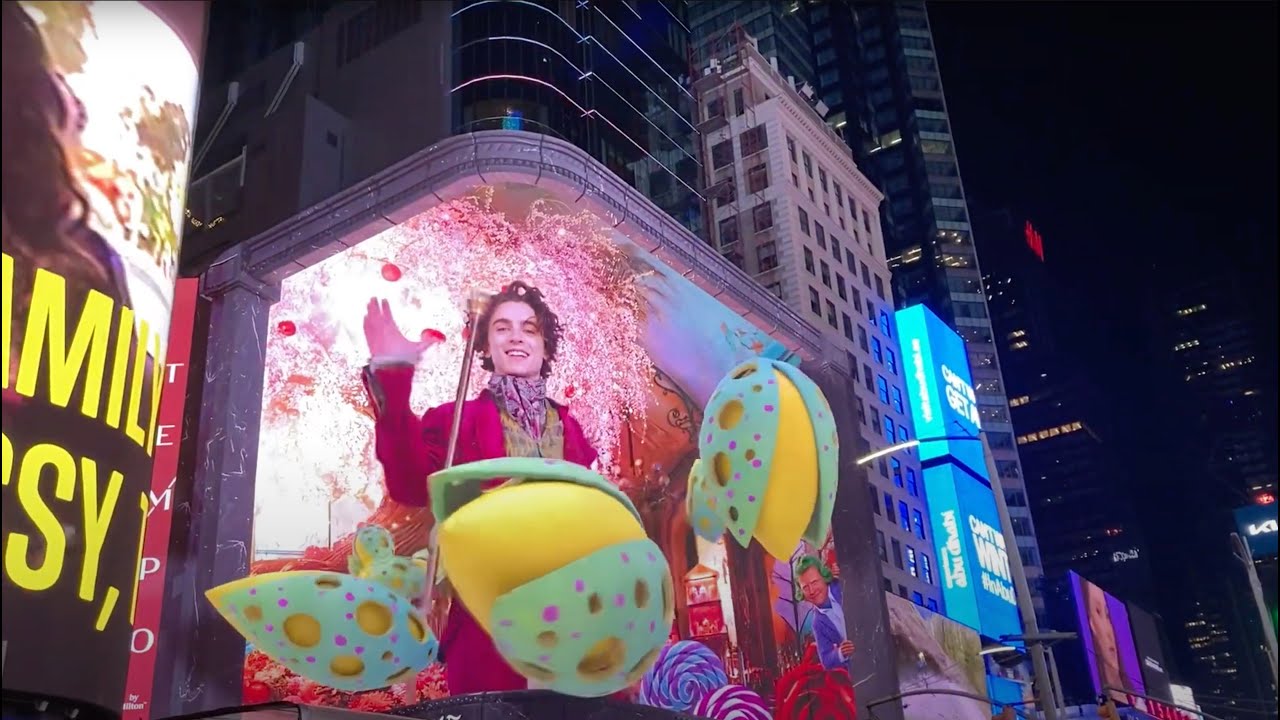 Tại Quảng trường Thời đại, Warner Bros đã đưa Willy Wonka vào cuộc sống với một tấm biển quảng cáo 3D đầy mê hoặc có sự góp mặt của Timothée Chalamet. Hoạt động này đã chứng minh tiềm năng đắm chìm của hình ảnh 3D anamorphic, thu hút sự chú ý của người qua đường giữa hàng loạt màn hình nhộn nhịp. Sự xuất hiện giống như thật của Chalamet, cùng với một chiếc mũ lưỡi trai, đã tạo nên một khoảnh khắc khó quên, chứng minh hiệu quả của quảng cáo được cá nhân hóa và đắm chìm.
