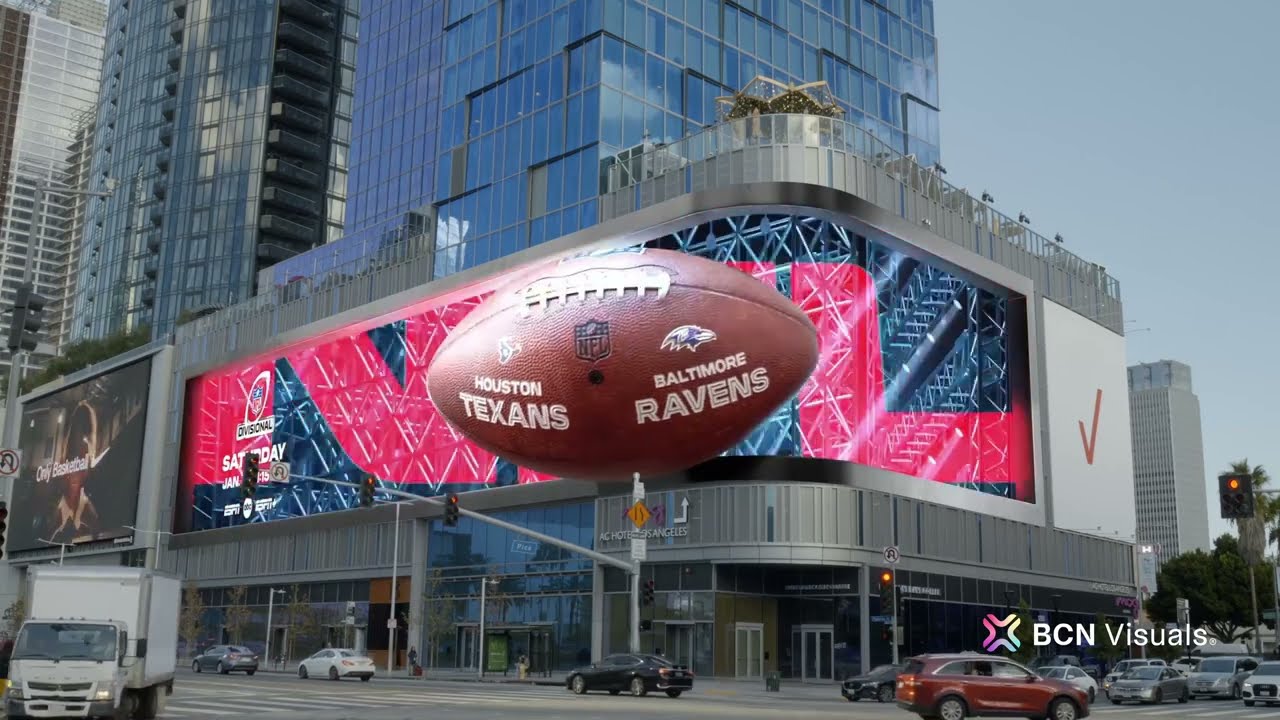 Sự hợp tác của NFL với BCN Visuals đã tạo ra một biển quảng cáo 3D gây kinh ngạc cho sự ra mắt của các đội phân khu. Hình ảnh động bao gồm bóng bầu dục bay và mũ bảo hiểm di chuyển trong mê cung giống như Tron, tích hợp liền mạch các logo của đội. Sự kích hoạt này, cùng với màn hình Super Bowl của The Sphere, nhấn mạnh cam kết của NFL trong việc thúc đẩy ranh giới của công nghệ kỹ thuật số trong quảng cáo thể thao.